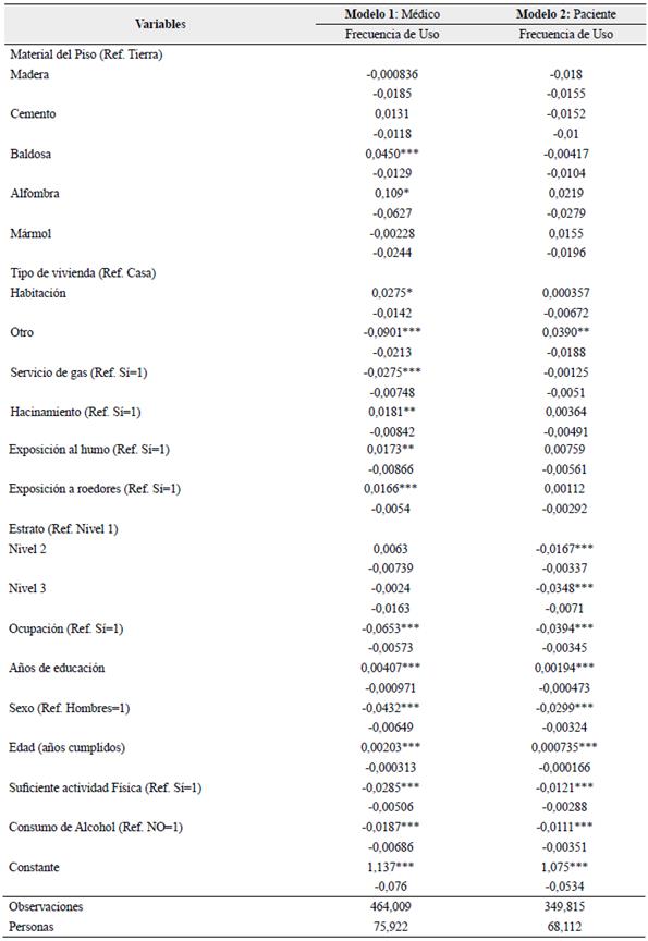 Dentro del grupo de factores demográficos y de riesgos para la salud, la edad muestra una relación importante. Cuanto mayor es la edad, mayor es la frecuencia de uso de servicios de salud. El coeficiente de la variable sexo resultó significativo, señalando que las mujeres tienen una mayor frecuencia de uso de servicios de salud que los hombres. De igual forma, los hábitos evidencian que son fundamentales a la hora de determinar la demanda, por lo que hacer suficiente actividad física y no consumir bebidas alcohólicas disminuyen la frecuencia de uso de servicios de salud.
