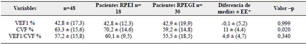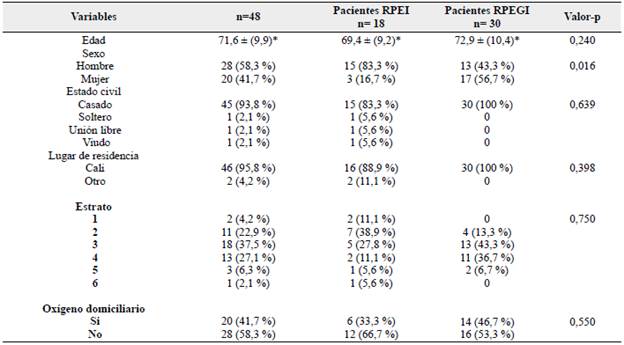 Enla Tabla 1 se describenlasvariables sociodemográficas de los pacientes, se encontró una edad promedio de 69,4 ± 9,2 para el grupo RPEI y 72,9 ± 10,4 para el grupo RPEGI respectivamente. Otras variables como estado civil, lugar de residencia, estrato socioeconómico y uso de oxígeno domiciliario no presentaron diferencias estadísticamente significativas. El sexo, en cambio, mostró una mayor prevalencia de hombre para el grupo de RPEGI con 15 pacientes (83,3 %) comparado con el grupo RPEGI, con 13 pacientes (43,3 %), evidenciando una diferencia estadísticamente significativa valor (-p = 0,016).