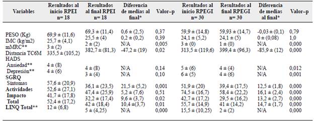 En la Tabla 3 se presentan los cambios luego del programa de RP para ambos grupos, en esta se muestra que en las variables antropométricas como peso y talla no se presentaron diferencias significativas. La disnea mMRC presentó una mediana y amplitud intercuartil al inicio del programa de RP de 3 (2) y 3 (0) para los grupos RPEI y RPEGI y que disminuyó luego del programa de RP a 2 ± (2) y 1 ± (0) respectivamente. La distancia recorrida en el TC6M presentó un incremento de 47,2 ± (19) metros en el grupo de RPEI y 85,9 ± (12) metros en el grupo RPEGI valor -p = <0,05. Respecto a la ansiedad y depresión, se presentaron disminuciones significativas en la puntuación del HADS solo para el grupo RPEGI (p = 0,0120 y p = 0,001).
