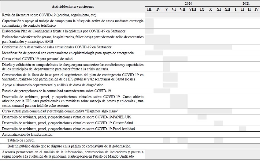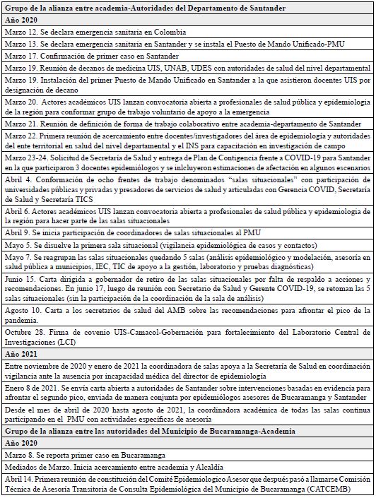 Objective: Systematize the experience of the collaborative work carried out between academic actors in the region and the health authorities from the Department of Santander, Colombia in the framework of the health emergency due to COVID-19 during 2020-2021.