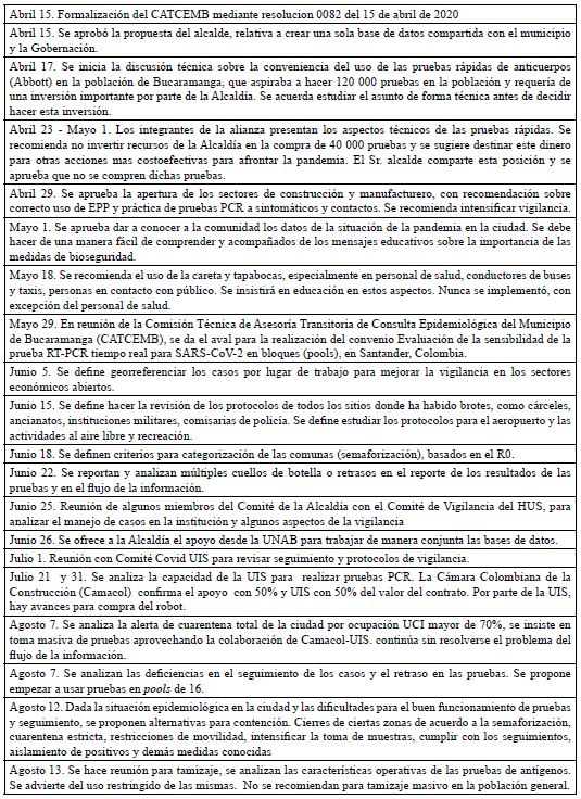 Para el caso municipal los expertos se contactaron mediante la activación de redes de conocidos, esto resultó en invitados expertos en epidemiología e infectología pertenecientes a la UNAB, UIS, UDES y a la Universidad de Wisconsin (USA). El comité quedó constituido por funcionarios de la Alcaldía (alcalde, secretario y subsecretario de Salud, asesor de salud, gerente de la Empresa Social del Estado Instituto de Salud de Bucaramanga-ESE ISABU y dos epidemiólogos) y cuatro expertos académicos externos.
