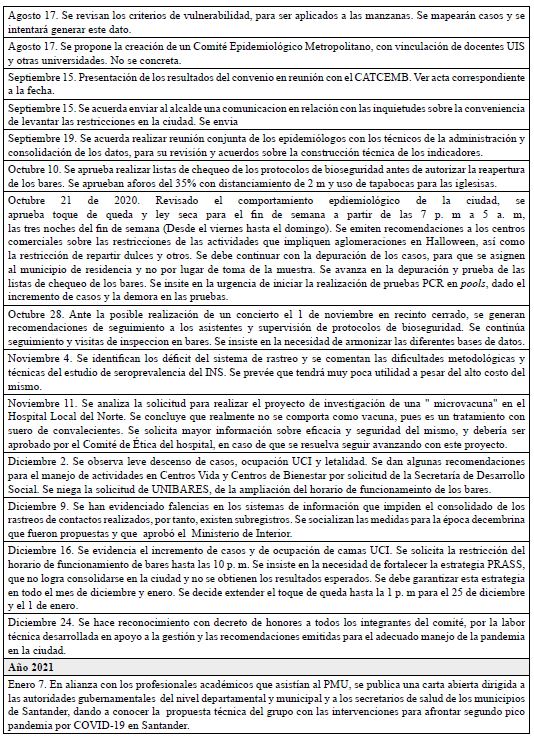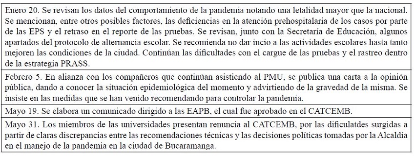 Por ejemplo, en lo referente a la formalización de la relación, se hizo más evidente en el ámbito municipal. Los encuentros primero de naturaleza informal se organizaron en torno a lo que se conoció como el Comité que fue llamado de manera formal, mediante la resolución 0082 del 15 de abril de 2020, como Comisión Técnica Asesora Transitoria de Consulta Epidemiológica en el municipio de Bucaramanga (Tabla 1). Por su parte, a nivel departamental, algunos actores consideran que la participación de la academia se hizo formal al quedar contemplada en la estructura del Puesto de Mando Unificado-PMU. Contrario a esto, otros no reconocen que exista un documento oficial de la alianza.