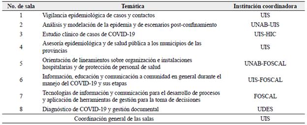 En el ámbito departamental, el grupo de académicos de la UIS que se vinculó inicialmente a la colaboración rápidamente realizó una convocatoria de inscripción abierta a profesionales que trabajaran en el área de la epidemiología y salud pública en la región para conformar un grupo voluntario de apoyo a la emergencia. La respuesta fue inmediata y generosa. Respondieron al llamado 66 profesionales de distintas disciplinas en su mayoría del área de la salud y algunos del área de la comunicación social, los cuales se agruparon en ocho frentes de trabajo, que fueron denominados salas situacionales.