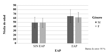 La edad media de la muestra fue de 49,4 ± 6,63 años; se encontró que la EAP se presentó en adultos mayores con una media de 62,8 ± 5,89 años; 64,5 ± 7,78 en varones y 61,7 ± 5,86 años en mujeres, evidenciándose una mayor dispersión en hombres (Figura 2).