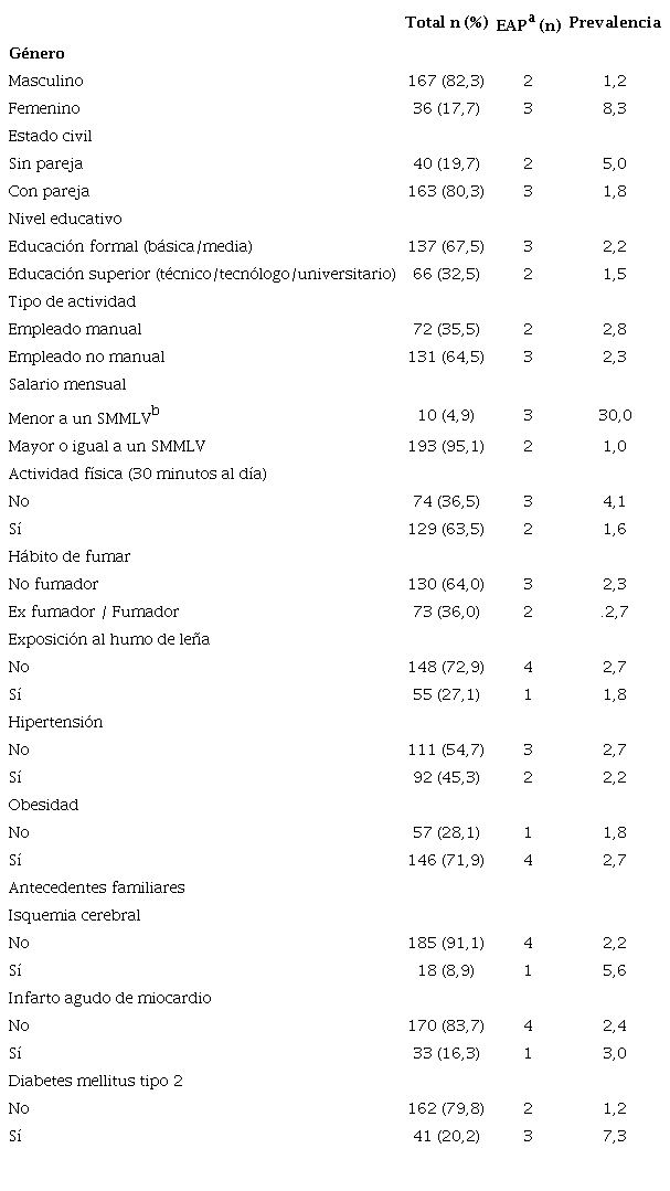 Adicionalmente, los trabajadores con EAP no realizaban actividad física frecuentemente (4,1 %), eran obesos (2,7 %) y han estado o están expuestos al hábito tabáquico (2,7 %). De igual forma, aquellas personas con antecedente familiar de infarto agudo de miocardio, isquemia cerebral y DM2 presentaron una prevalencia de la enfermedad del 5,6 %, 3,0 % y 7,3 °% respectivamente. En la Tabla 1 se exponen los principales resultados.