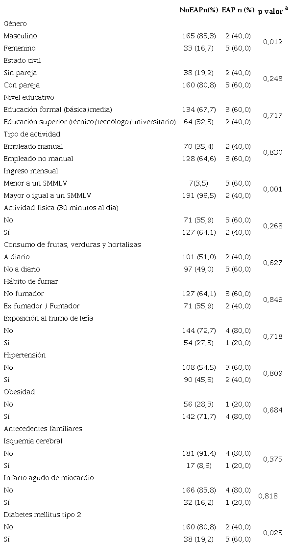 Por otro lado, se encontró que los sujetos con EAP tenían educación formal, ganaban menos de un SMMLV y realizaban trabajos manuales. Con relación a esto, otros autores afirman que el control y desarrollo de factores de riesgo cardiovasculares pueden estar condicionados a las actividades laborales y el nivel socioeconómico, que a su vez repercuten en la calidad de vida y traen consigo consecuencias sociales que generan un mayor riesgo de presentar EAP24.