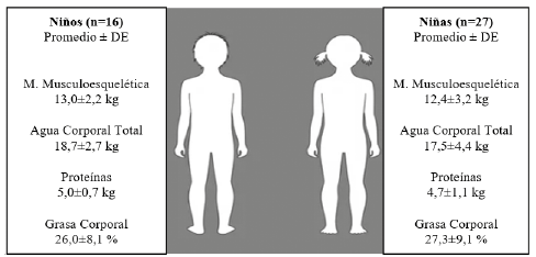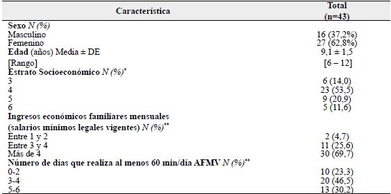 En total participaron 43 escolares con un promedio de edad de 9,1 ± 1,5 años, 27 (62,8 %) de sexo femenino. El 53,5 % de los cuidadores reportaron pertenecer al nivel socioeconómico medio-alto y el 69,7 % informó recibir ingresos económicos mayores a cuatro salarios mínimos legales vigentes. Tabla 1.