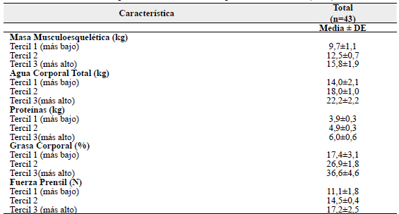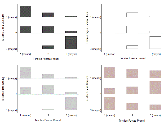 Conclusión: Los niños en el tercil más alto de fuerza prensil presentan los terciles más altos de masa musculoesquelética, agua corporal total y proteínas.