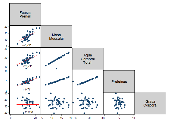 Discusión: Nuestros resultados son consistentes con evidencias previas que identifican a la fuerza prensil como un indicador de la composición corporal, específicamente en las variables de masa musculoesquelética y proteínas.