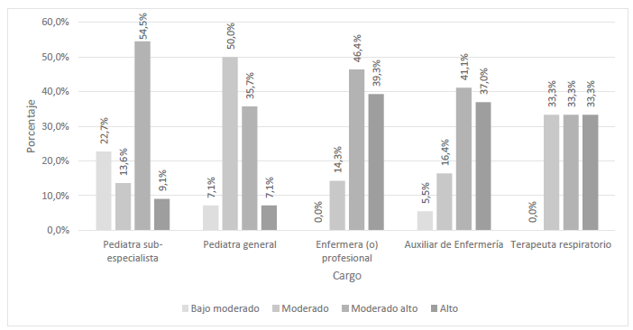Se encontró una asociación entre el cargo desempeñado y el MM (Razón de verosimilitud: p = 0,007). Al observar al interior del cargo, más de la mitad de los pediatras subespecialistas presentaron "moderado alto" MM. Situación parecida ocurrió entre enfermeras profesionales y auxiliares quienes presentaron una proporción cercana a la mitad de "moderado alto" MM. Entre los pediatras generales el MM "moderado" predominó, Figura 1. Cuando se analizó la asociación entre el cargo y el MM para hombres y mujeres de manera independiente, se observó que dicha asociación es real y no se debe a la influencia del sexo (Razón de verosimilitud: en hombres p = 0,175 y en mujeres p = 0,073).