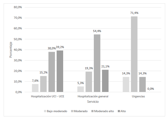En la población analizada se encontró una asociación entre el servicio en el cual se desempeña el profesional y el MM (Razón de verosimilitud: p = 0,004). En el servicio de hospitalización UCI-UCE, el porcentaje mayor lo representa el "alto" MM, seguido muy de cerca por "moderado alto". Para la hospitalización general, más de la mitad de los profesionales consideran el MM "moderado alto", mientras en el servicio de urgencias más de dos tercios presentaron "moderado" MM, Figura 2. Cuando se analizó de manera independiente la relación entre el servicio y el MM, se observó que dicha asociación no era real, ya que estaba influenciada por el sexo (Razón de verosimilitud: en hombres p = 0,299 y en mujeres p = 0,023).