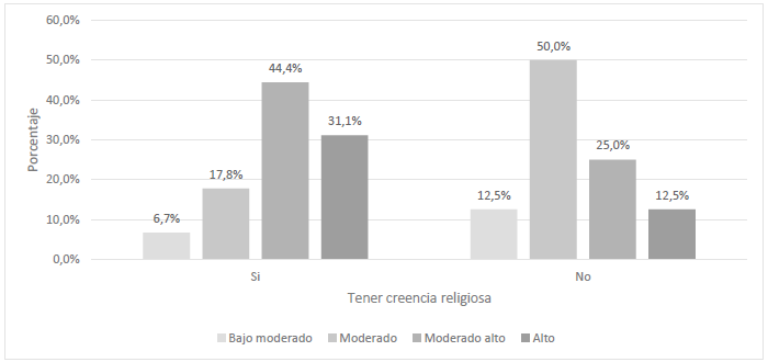 Los análisis reportaron una asociación entre el MM y tener una creencia religiosa (U de Mann-Whitney: p = 0,048). Entre los que si tienen creencia religiosa el mayor porcentaje fue representado por "moderado alto" MM, seguido en una tercera parte por "alto" MM. Entre quienes expresaron no tener creencia religiosa, la categoría "moderado" MM reflejó la mitad de ellos, Figura 3. Cuando se analizó la asociación entre tener creencia religiosa y el MM en forma separada por sexo, se corroboró que dicha asociación es real y no se debía a la influencia del sexo (Razón de verosimilitud: en hombres p = 0,247 y en mujeres p = 0,464).
