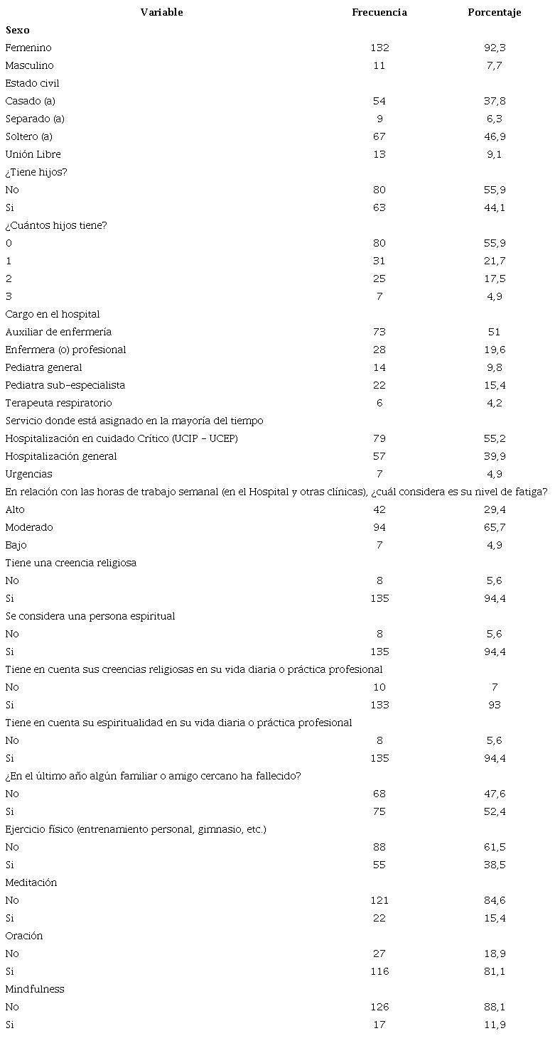 Variables: se consideraron los ítems de la escala anunciada, además de edad, sexo, estado civil, religión, si tiene hijos y cuántos, cargo en el hospital, servicio en el que trabaja, antigüedad de laborar en el hospital, fallecimiento de familiares o de un ser querido en el último año, si labora en otra institución y cual, horas semanales dedicadas a laborar tanto en el Hospital Pablo Tobón Uribe como en otras instituciones y que expresaran su nivel de fatiga según esas horas laboradas en alto, medio o bajo. Además, si consideran tener creencia religiosa, considerarse espiritual, si aplica esto en su vida, si realiza actividades como: meditación, mindfulness, yoga, y con qué frecuencia.