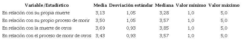 Methodology: This was a transversal analytic study to apply the Collett-Lester Fear of Death Scale on 143 people: 25,2 % were general pediatricians and subspecialists, 70,6 % were professional nurses and medical assistants, and 4,2 % were respiratory therapists. The analysis included descriptive statistics, Chi2 test, Mann-Whitney U test, Fisher, StudentsT, ANOVA and Cronbach's Alpha.