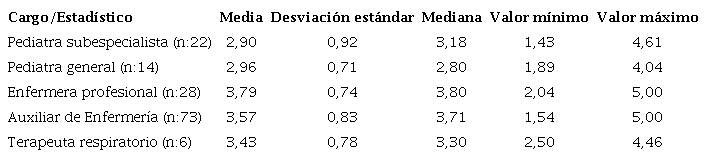 En el estudio se incluyeron las respuestas de 143 personas, de las cuales un 25,2 % correspondieron a pediatras generales y subespecialistas, un 70,6 % fueron profesionales de enfermería y auxiliares, y un 4,2 % terapeutas respiratorios. Siendo estos, porcentajes que se corresponden proporcionalmente con su equivalente en la población objetivo a encuestar. Se desconocen las razones que llevaron a que el 37 % de los invitados a participar no lo hicieran. La Tabla 1 muestra las características generales de los participantes.