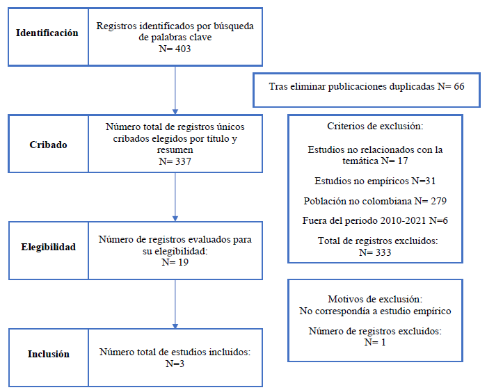 Los criterios de inclusión para los trabajos fueron: a) tener acceso a texto completo; b) que el estudio se hubiera realizado entre los años 2010 hasta marzo del 2021; c) que la muestra fuera con población colombiana; y d) que estuvieran escritos en el idioma español o inglés.