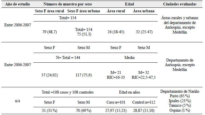 La muestra en todos los artículos fue no probabilística, por conveniencia. El primer artículo segmentó la muestra en casos de suicidio ocurridos en el contexto rural y urbano. El segundo artículo retomó casos de suicidio ocurridos entre 2006 y 2007 y los agrupó por sexo, hombres y mujeres. Y el tercer artículo comparó casos y controles en dos grupos: un grupo integrado por personas que se suicidaron y otro por individuos que fallecieron por lesiones no intencionales (Tabla 3).