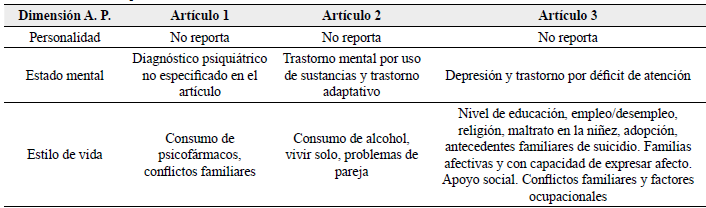 Los tres artículos objeto de análisis mencionaron haber empleado la técnica de autopsia psicológica; cabe destacar que en el primer artículo sólo se alude a su uso, sin la descripción del cómo se empleó bajo una técnica particular como el PAP o el MAPI. En el segundo artículo se explicó de forma laxa, sin soporte teórico, el uso de la técnica. En el tercer y último artículo se empleó un cuestionario propio, del que manifiestan está basado en la técnica de autopsia psicológica, pero sin respaldo teórico.