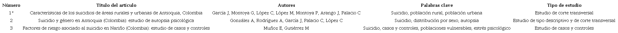 Results: they show that in Colombia during the last 10 years the number of studies published in databases amounts to 19, of which 16 did not use the psychological autopsy procedure and only three of them did.