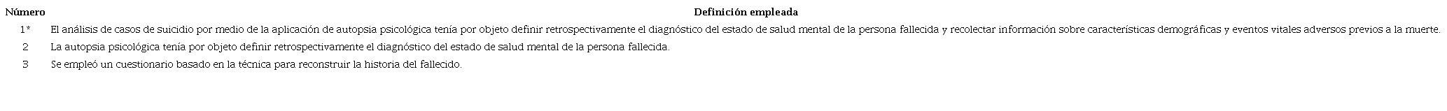 Al revisar la definición o las teorías sobre la autopsia psicológica, que se esperaría fueran incluidas en los estudios que refieren haberla empleada, específicamente los que analizamos en esta revisión, identificamos que en ninguno de ellos fue incluida alguna en particular. El primer artículo relega la definición a la inferencia que realizamos sobre lo descrito en el método. En el segundo artículo, se omite la definición y en el apartado del método se hace saber que se empleó la técnica, sin profundizar en la misma. En el último artículo, no se define y tan solo se menciona que se empleó un cuestionario basado en la técnica para reconstruir la historia del fallecido. Ningún artículo hace referencia a un autor particular o un constructo teórico para explicarla, limitándose a informar sobre su uso de forma ambigua (ver Tabla 2).