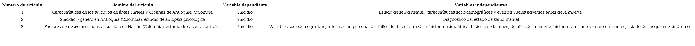 Los tres artículos en cuestión consideraron el suicidio como variable dependiente, y como variables independientes relacionadas se incluyeron variables múltiples como se describe en la Tabla 4.