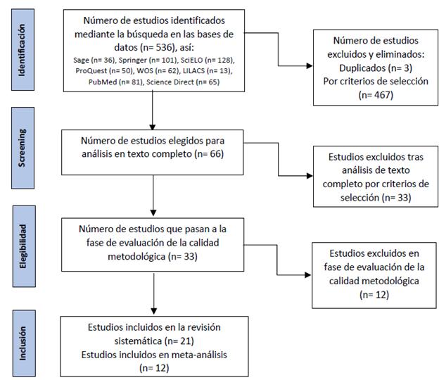 Se encontraron 536 estudios primarios publicados, se eliminaron los duplicados y se aplicaron criterios de selección, de esta forma, pasaron a evaluación de texto completo 66, este proceso se sintetiza en el flujograma selección de estudios en la Figura 1. Del número total de estudios valorados en su calidad metodológica (n: 33) se descartaron los que obtuvieron un Kappa de Fleiss menor a 0,61, indicador de baja concordancia, o un cumplimiento menor al 60 % en las listas de chequeo de calidad metodológica usadas, o porque a la lectura de texto completo no cumplía con todos los criterios establecidos en la PICO. Esta fase permitió descartar 12 estudios13-24, según se ve en la Tabla 2, para un total de 21 estudios incluidos en la revisión en idiomas inglés y español, publicados entre los años 2004 y 2020. De estos, 9 eran procedentes de países latinoamericanos, 4 de países europeos, 4 de países asiáticos y 4 de países africanos, de los cuales solo 12, en cumplimiento de las variables moderadoras, fueron sometidos a metanálisis.