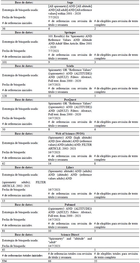 La búsqueda fue realizada del 1 de julio al 30 de octubre de 2021, se incluyeron estudios en inglés y español encontrados en las bases de datos Web of Science, PubMed, Lilacs, SciELO, Sage, ScienceDirect, ProQuest y Springer, con los términos MeSH/DeCS Spirometry, Adult, Reference Values y Altitude, de diseños observacionales (cohortes, casos y controles, transversales) publicados entre 2001 y 2020. Se utilizaron combinaciones específicas para cada base de datos, como se evidencia en la Tabla 1. Se tomaron tres momentos de control de este proceso de búsqueda: número total de referencias iniciales recuperadas con los términos y filtros de búsqueda desde cada una de las bases de datos, número total de referencias que cumplen los criterios de inclusión y exclusión tras la revisión de títulos y resúmenes, y número total de estudios que pasan a revisión de texto completo. Cuatro revisores diligenciaron matriz de caracterización de artículos de acuerdo a pregunta PICO.