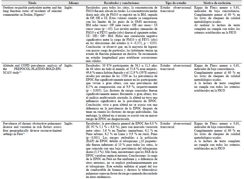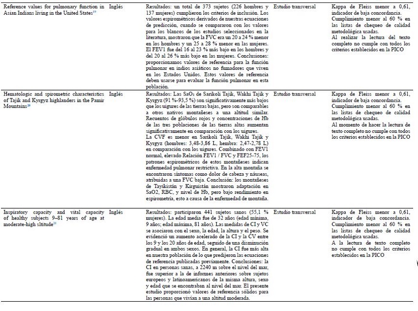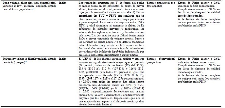 La revisión sistemática realizada permite evidenciar exposición a diferentes alturas en los 21 estudios incluidos, con uso de valores de referencia de Crapo, Khudson y Hankinson en alturas menores a los 1500 metros sobre el nivel del mar, y en alturas mayores, las ecuaciones de Nhannes III, Hedenstrom, Quanjer y ecuaciones de la Iniciativa Global de la Función Pulmonar (GLI).