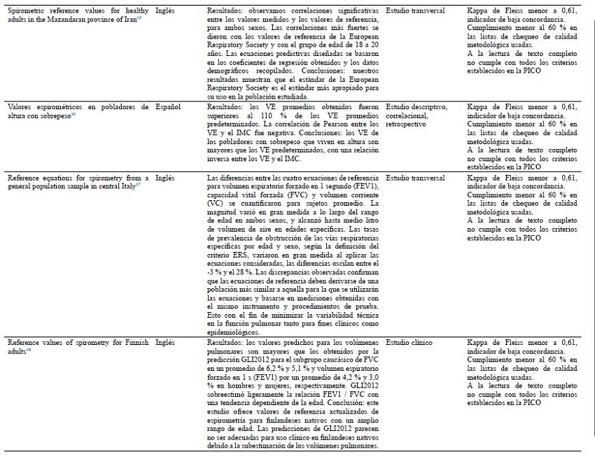 La revisión de la literatura demuestra que la investigación debe dirigirse a formular valores de referencia y ecuaciones en poblaciones con características raciales y geográficas similares para establecer valores espirométricos específicos que disminuyan la posibilidad de extrapolar valores en comunidades diferentes, las cuales pueden dar lugar a interpretaciones erróneas8. Los valores de referencia en diferentes poblaciones sanas deben ser validados, esto permitirá al personal sanitario establecer diagnósticos realmente particulares y por tanto dirigir tratamientos y seguimientos que en efecto mejoren los desenlaces y pronósticos de patologías cardiopulmonares. En este sentido, la presente revisión sistemática de la literatura planteó la pregunta de investigación ¿Cuáles son las diferencias de valores de referencia de espirometría forzada en población adulta residente en alturas mayores y menores a 1500 m s. n. m?