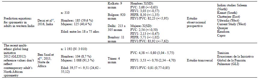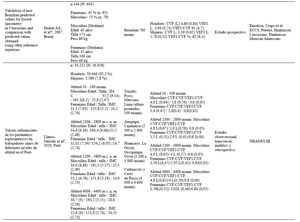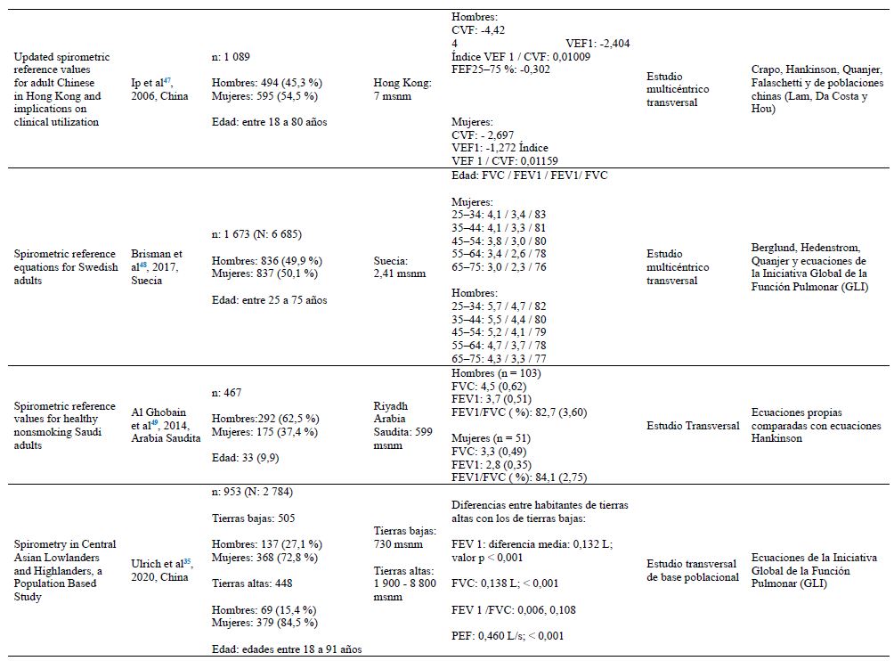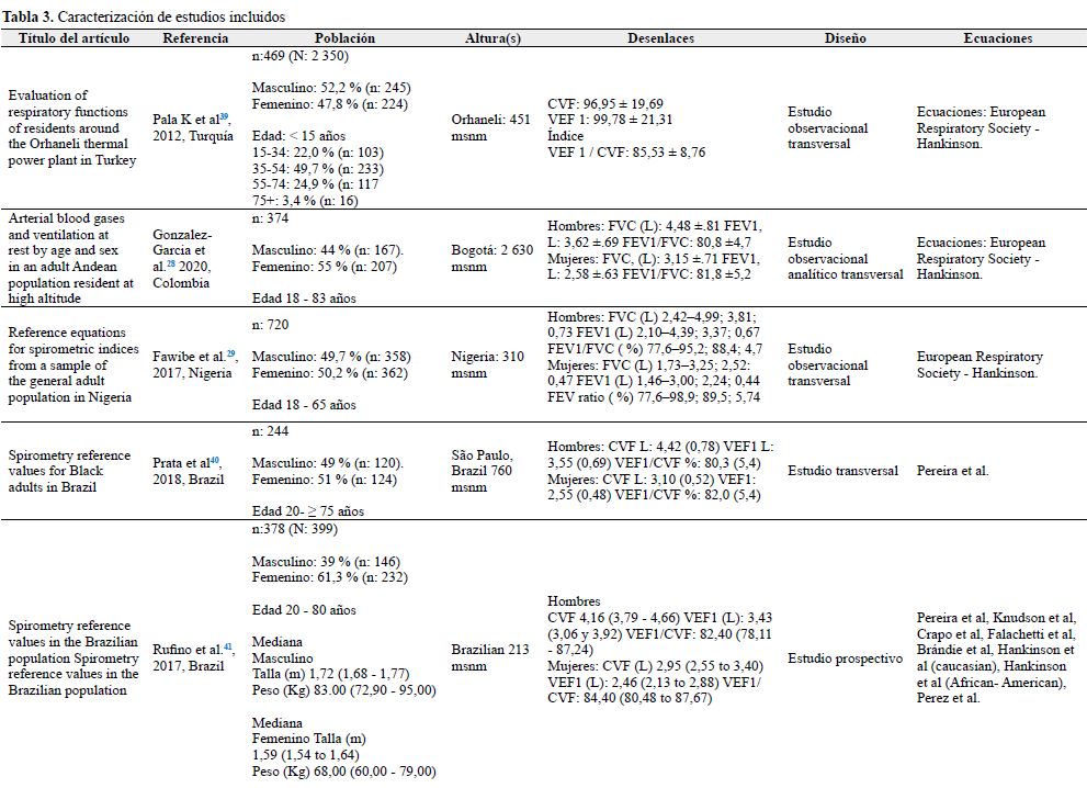 Los 21 estudios incluidos en la RSL aportan una muestra de 48 923 participantes, el 75,9 % de sexo masculino (n: 37 121) y el restante 24,1 % de sexo femenino (n: 11 802), con edades que oscilan entre los 15 y 80 años, expuestos a alturas que oscilan entre 2,4 m s. n. m y 4440 m s. n. m. Las ecuaciones más frecuentemente usadas por estos estudios son las de Hankinson (n: 10; 47 %), Crapo (n: 4; 19 %), NHANES III (n: 4; 19 %) y las de la Iniciativa Global de la Función Pulmonar (GLI) (n: 3; 14 %), se aclara que varios estudios usaron más de una ecuación de referencia como se ve en la Tabla 3.