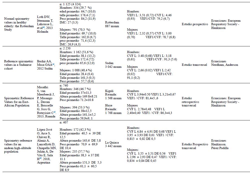 Conclusions: The spirometry reference values vary according to height (higher at heights >1,500 m.a.s.l.) and sex (higher in men). It is necessary to have broader and more convincing evidence on the subject.