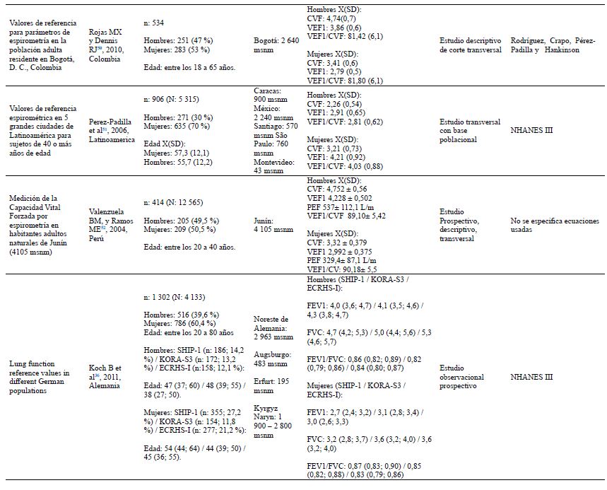 Conclusiones: Los valores de referencia de espirometría varían de acuerdo con la altura (mayores en alturas > 1500 m s. n. m) y el sexo (más elevados en hombres). Es necesario contar con evidencias más amplias y contundentes en la temática.