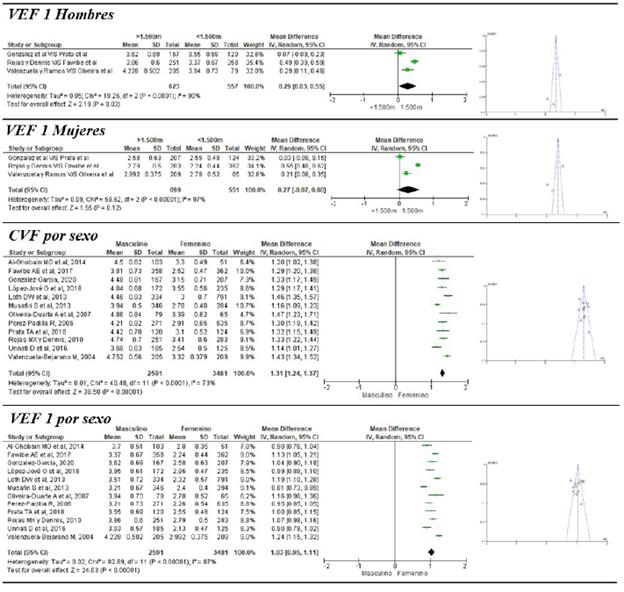 Resultados: Se contó con 48 923 participantes de alturas entre 2,4 y 4440 m s. n. m. Hay diferencias iniciales al relacionar la altura (+/-1500 m s. n. m) con el VEF1 (hombres: DM 0,29; IC: 0,03-0,55; mujeres: DM 0,27; IC: -0,07-0,60) y los valores de referencia con el sexo: CVF (DM 1,31; IC: 1,24-1,37) y VEF1 (DM: 1,03; IC: 0,95-1,11). Se reportó alta heterogeneidad y riesgo de sesgo de publicación.