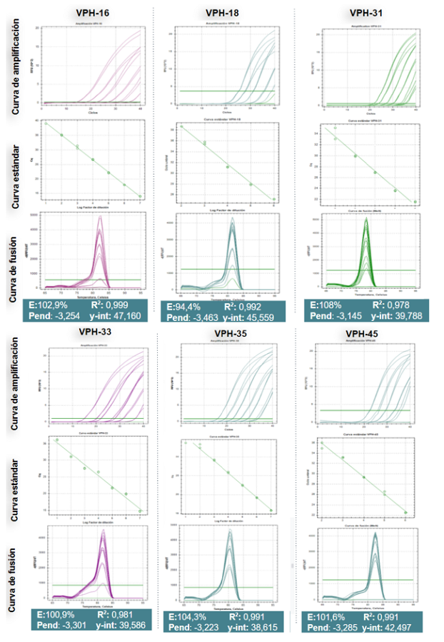 Se estandarizó la PCR en tiempo real del oncogén E7 para genotipificación y cuantificación de 6 genotipos de VPH-AR altamente frecuentes. Esta puede ser una herramienta diagnóstica específica, rápida y de alto desempeño, que permitiría procesar un número elevado de muestras y contribuiría en la prevención del CCU. El siguiente paso será multiplexar esta prueba usando tecnología de sondas marcadas con fluoróforos y ampliar la cobertura de detección a 14 genotipos de VPH-AR para brindar un diagnóstico más sensible y específico.