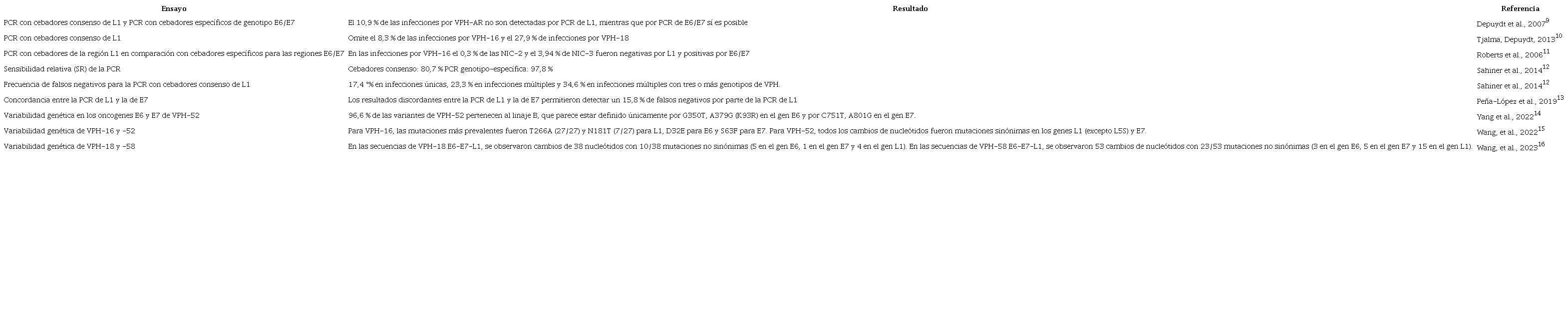 Muchos protocolos se basan en la amplificación de ADN mediante PCR y utilizan diferentes cebadores que se dirigen principalmente hacia el gen L1 del virus, que posteriormente permite la diferenciación en genotipos por medio de sondas específicas que hibridizan los productos amplificados de la PCR. Sin embargo, existen regiones diana de mayor significancia clínica y epidemiológica como el oncogén E7, indispensable en el proceso cancerígeno de cuello uterino y presente durante todas las etapas de la progresión de la enfermedad, a diferencia del gen L1 que puede interrumpirse durante la integración del ADN viral en el genoma del hospedador hasta en el 11 % de los casos8,9. Estos datos sugieren que la PCR con cebadores consenso de L1 puede conducir a una pérdida significativa de detección de casos, mientras que la PCR con cebadores específicos para E7 puede proporcionar resultados más precisos y confiables, pues reduce la competencia para la amplificación del ADN cuando hay múltiples infecciones por VPH, mejorando notablemente la especificidad y sensibilidad del ensayo (Tabla 1). Por lo anterior, el objetivo del presente estudio fue estandarizar una PCR en tiempo real del oncogén E7 (E7-qPCR) para genotipificación y cuantificación de 6 genotipos de VPH-AR.