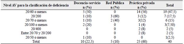 El 60,98 % (50 personas) indicaron conocer los criterios para identificar a un paciente con baja visión, sin embargo, tras indagar sobre el nivel de AV en el mejor ojo a tener en cuenta para clasificar la deficiencia visual solo el 40,78 % (40 personas) respondieron y el 23,17 % (19 personas) indicaron acertadamente como criterio una AV mejor corregida de 20/60 o menos Tabla 1.