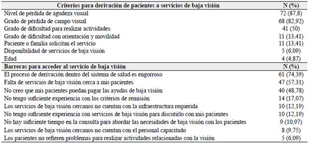 Resultados: El 47,5 % de los profesionales tiene claro el nivel de agudeza visual para clasificar a una persona con baja visión. Las principales barreras identificadas para el acceso a servicios de baja visión fueron: el proceso de derivación dentro del sistema de salud es engorroso (74,39 %), falta de servicios cerca (57,31 %) y considerar que los pacientes no pueden pagar las ayudas (48,78 %).