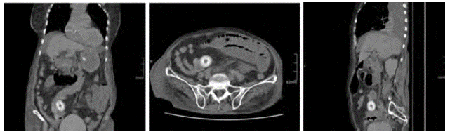 Se ordenó TAC de región torácica y abdominal contrastado. Se reportó una enfermedad aterosclerótica aórtica, cambios pulmonares parenquimatosos difusos alveolo-intersticiales de aspecto inflamatorio - infeccioso, consolidando en las regiones basales posterolaterales, cambios sugestivos con componente atelectásico y patrón en vidrio esmerilado en las áreas anteriores visibles, con obstrucción intestinal mecánica con aparente zona transicional en la región hipogástrica en asa intestinal ileal y perforación vesicular con presencia de litiasis en asa intestinal delgada, lo cual condicionaba el compromiso obstructivo de dimensiones 3,5 x 3,3 x 3,8 cm, líquido libre en cavidad abdominopélvica y espondilosis degenerativa de columna vertebral, Figura 1.