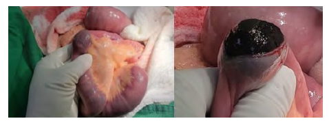 Con los anteriores hallazgos, la paciente fue sometida a laparotomía exploratoria con los siguientes hallazgos: gran distensión de asas intestinales delgadas, con edema y sitio de obstrucción a nivel de íleon distal ocasionado por lito biliar de aproximadamente 3,5 cm de diámetro que condiciona obstrucción intestinal total, Figura 2. Después de una evaluación exhaustiva de la cavidad peritoneal se realizó enterolitotomía con extracción de lito biliar y enterorrafia manual en dos planos en sentido transversal con material de sutura absorbible (ácido poliglicólico y polipropileno) y se cerró la cavidad peritoneal.
