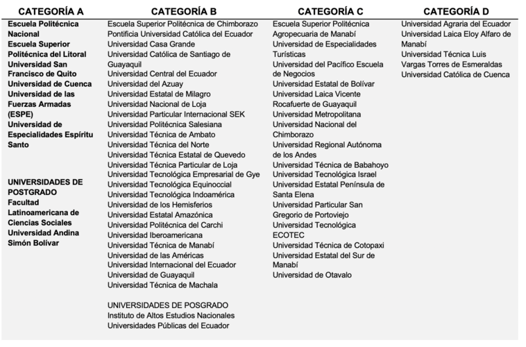 Según los tipos de IES, se ha categorizado a las universidades por las letras A, B, C y D y otros para jerarquizarlas de acuerdo con su calidad, como se visualiza en la tabla a continuación. Ello incide en los procesos meritocráticos de ingreso a las universidades, y puede llegar a responsabilizar al estudiante por sus orígenes sociales y excluir a la población, ya que no ingresó a una universidad mejor.