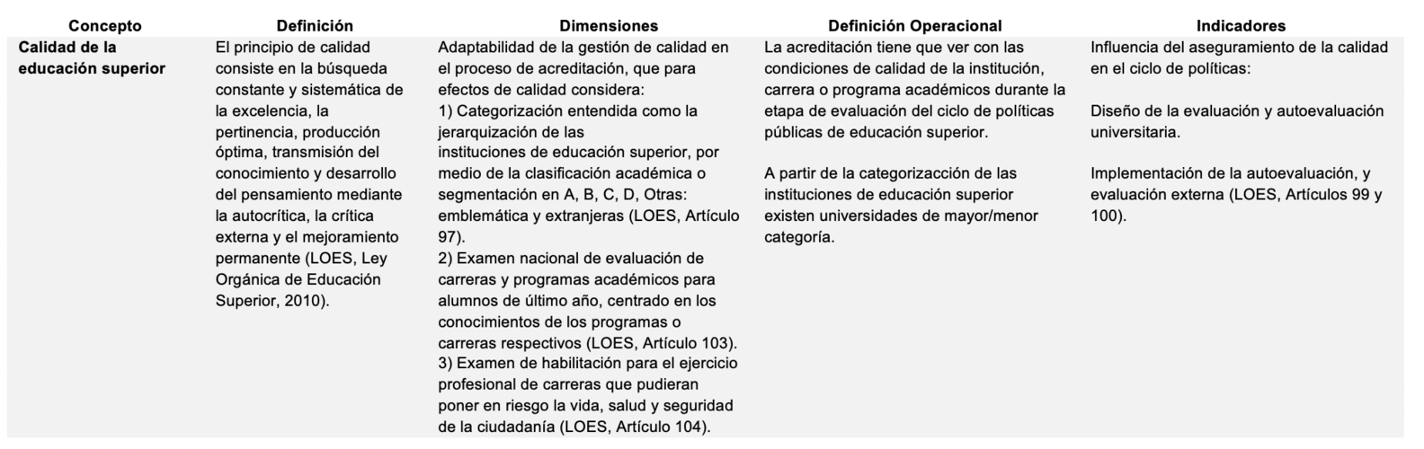 Dentro de la agenda política ecuatoriana y social surgió el debate sobre la calidad, con profundos cambios en las reformas universitarias, mediante la nueva Constitución de 2008 y la Ley Orgánica de Educación Superior (LOES), vigente desde el 12 de octubre de 2010 (Asamblea Nacional, 2010). Estas reformas emergen con fuerza con las políticas a las que fueron sujetas las instituciones de educación superior (IES). Dicho proceso llevó a la suspensión definitiva de 17 universidades de Ecuador y al establecimiento de un nuevo sistema regulatorio que permitiera la evaluación, acreditación y aseguramiento de la calidad luego del bachillerato, lo cual se planteó en la nueva LOES 2010 (CES, 2012).