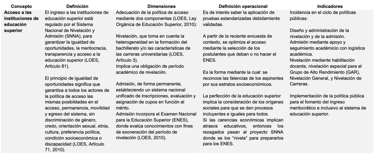 Se analizaron los recientes trabajos y documentos publicados en revistas especializadas, libros y conferencias realizados por organismos institucionales regionales. Además, se describirá de forma directa todas aquellas fuentes de los mismos actores internacionales como la Organización de las Naciones Unidas para la Educación, la Ciencia y la Cultura (UNESCO), y el Instituto Internacional de la UNESCO para la Educación Superior en América Latina y el Caribe (IESALC). Considerando las características del tema de estudio, el enfoque tiene una metodología multidisciplinar. Por una parte, se emplea un cuadro de las variables educación superior y acceso, como se aprecia en la tabla a continuación. También se desarrolló un enfoque metodológico descriptivo, complementándose con las técnicas estadísticas de las bases de datos más importantes.