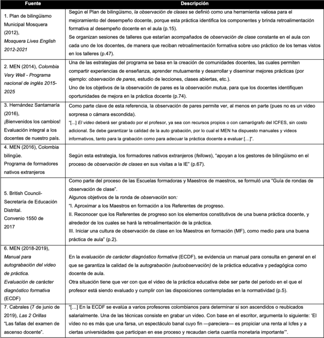 La tabla 1 está dividida en dos partes. La primera hace referencia a las fuentes de información en las que cuales emergieron como tema observaciones de clases de inglés, seguido de información tomada de la fuente original y aquella en la que el autor identificó apartados relacionados con el tema en cuestión. La invitación es a considerar las diversas particularidades que abarca el tema de observaciones de clase de inglés en Colombia.