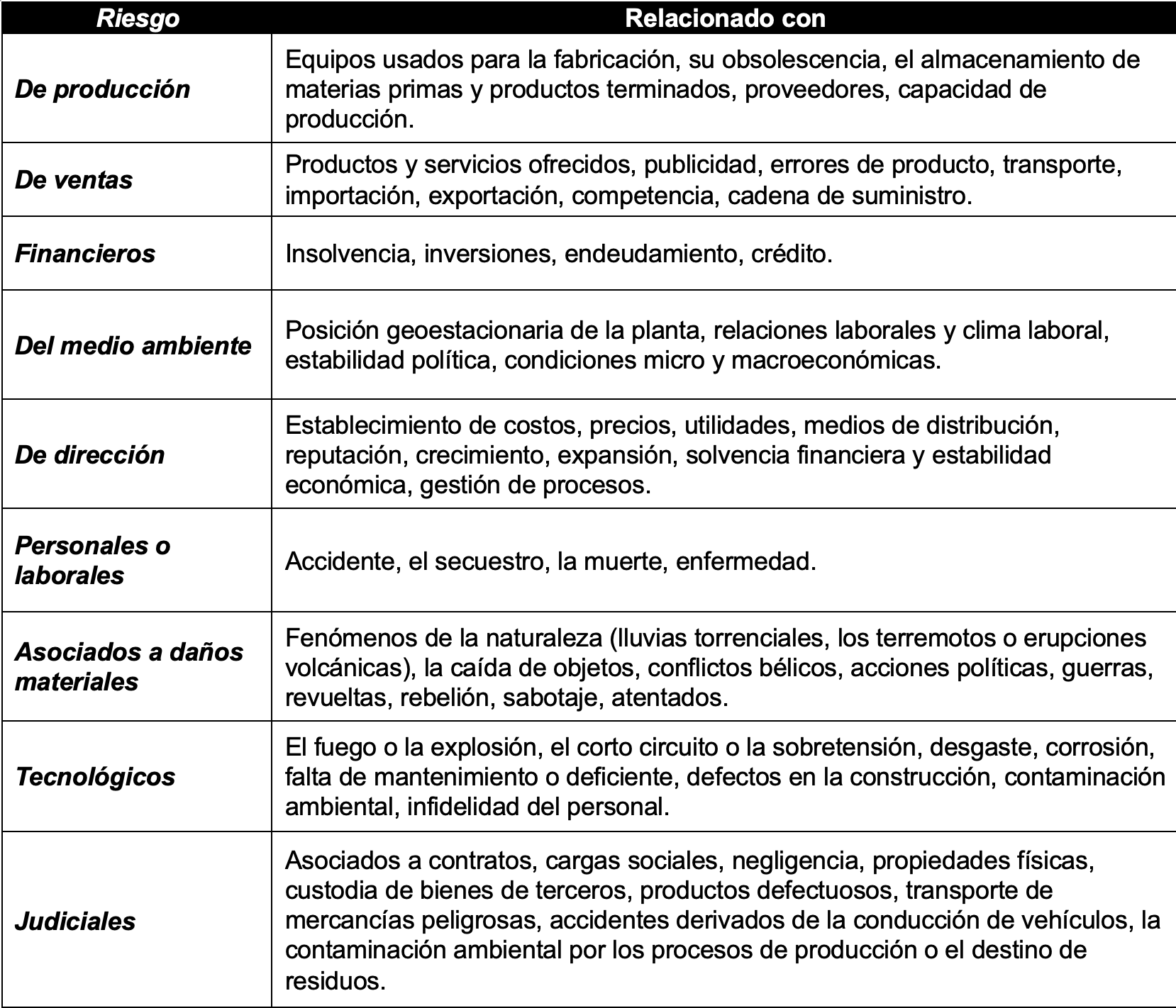 En el ámbito de las organizaciones, en el año 1990, la Fundación Mapfre[1] realiza una clasificación formal de riesgos en la empresa, en la que presenta un listado de riesgos que aún hoy permanece vigente, y que es de obligatoria referencia para quienes se encarguen de su gestión (ver tabla 1) (Aventín, 1990).
