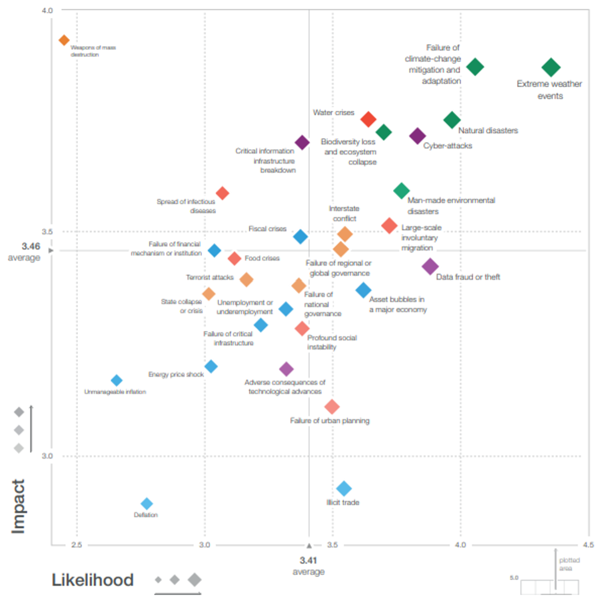 Este informe expresa que los riesgos que mayor probabilidad de ocurrencia e impacto tienen sobre una organización son los eventos climáticos extremos, los desastres naturales, la crisis por falta de agua, la pérdida de la biodiversidad, el colapso de los ecosistemas, los ataques cibernéticos, la pérdida de información o el mal uso de ella, así como daños hechos por el hombre a su entorno, entre otros riesgos. Algunos de estos, como el efecto de invernadero, no son asegurables, pero sí algunas de sus consecuencias. Por ejemplo, las afectaciones climáticas (lluvia, sequía, granizo, inundaciones, heladas) sobre los procesos y productos agrícolas, o sobre los bienes de una empresa, se cuentan cubiertos por pólizas de seguros.
