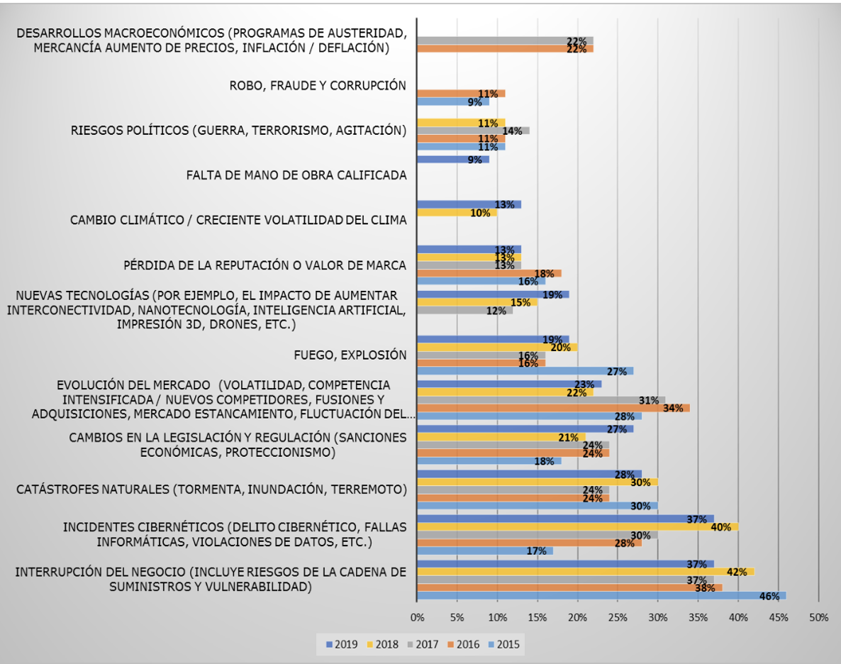 Para el año 2019, los primeros cinco riesgos fueron la interrupción del negocio (que incluye riesgos de la cadena de suministros y vulnerabilidad), los incidentes cibernéticos (delito cibernético, fallas informáticas, violaciones de datos, etc.), las catástrofes naturales (tormenta, inundación, terremoto), cambios en la legislación y regulación (sanciones económicas, proteccionismo), y evolución del mercado (volatilidad, competencia intensificada / nuevos entrantes, fusiones y adquisiciones, mercado estancamiento, fluctuación del mercado).