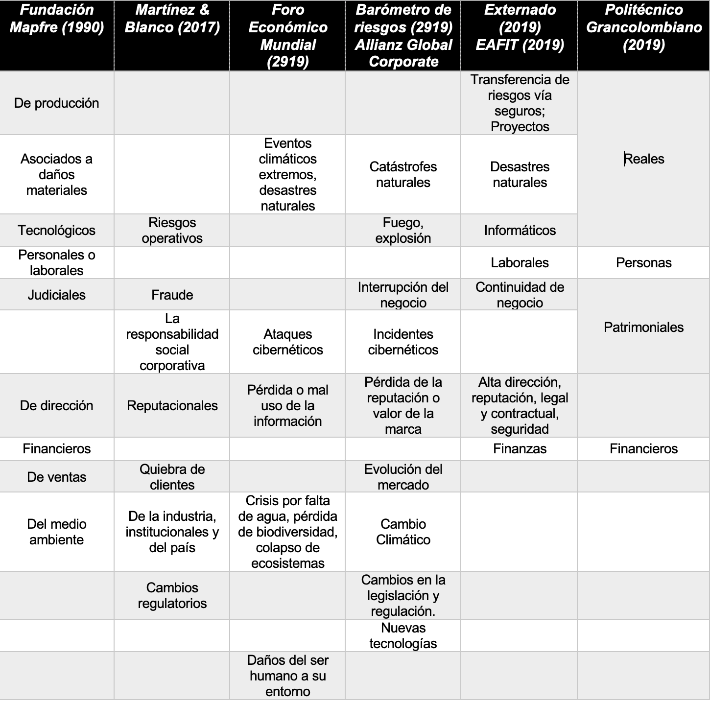 Para estructurar el conjunto de riesgos que preocupan a las organizaciones, se cruzaron los elementos comunes determinados por diferentes organismos y publicaciones especializadas en la gestión de este fenómeno en las empresas. Es así como se presentan las clasificaciones hechas por la Fundación Mapfre, el Foro Económico Mundial y el Barómetro de riesgos de Allianz Global Corporate.
