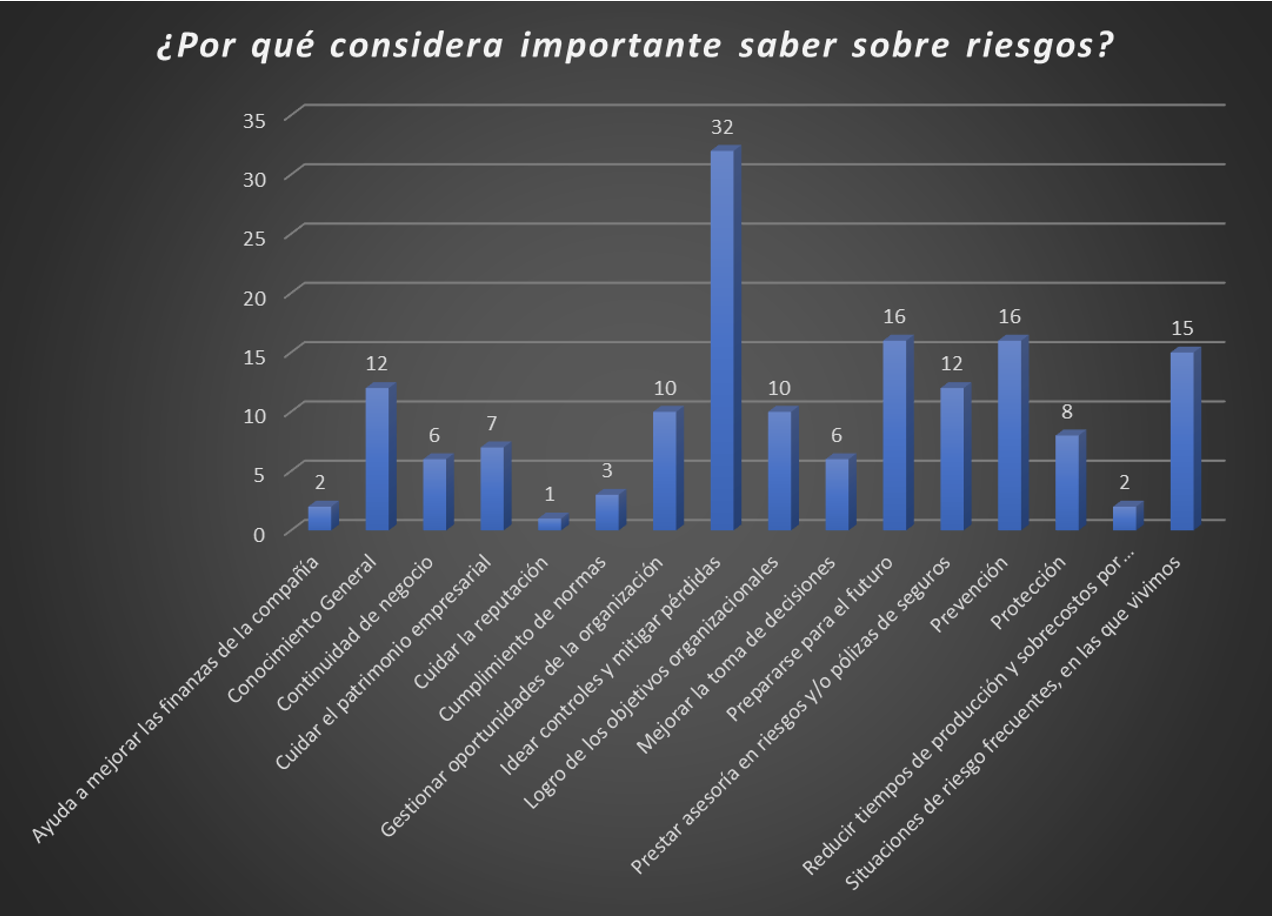 Cuando se analiza por perfil del encuestado, se tiene que los cinco temas sobre los que les gustaría aprender a los directivos de las organizaciones fueron: riesgos asociados a la dirección (42 respuestas), los riesgos financieros (40 respuestas), el riesgo cibernético (39 respuestas), riesgos asociados a las ventas (30 respuestas) y los asociados a la producción (27 respuestas). Los relacionados con pólizas de seguros (25 respuestas), se encuentran en el puesto 6 de 12.