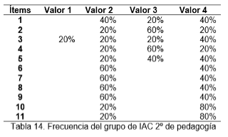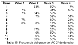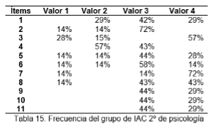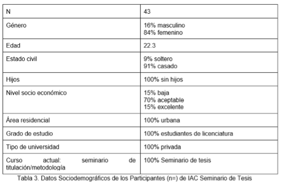 Para la recogida de datos en IAC, en la materia de Seminario de Tesis (ciclo escolar 19/3), se empleó la misma rúbrica analítica que se generó en CUIM. El grupo de estudiantes se formó de la siguiente manera: derecho (7 estudiantes), comunicación (10 discentes), pedagogía (12 estudiantes) y psicología (14 discentes). Véase la tabla 3.