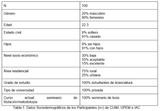 Los estudiantes que conformaron el grupo de CUIM, UPEM e IAC (ciclo escolar 18/3) fueron una muestra no probabilística, pues se trató de un estudio con un diseño de investigación instrumental, que aun cuando fue cuantitativa, las características de los discentes se asemejaron por la forma en que cada grupo diseñó su propio proyecto de investigación bajo la colaboración y el uso de estrategias de investigación. Esto correspondió a 100 estudiantes, conformado por dos equipos; el primero (50 estudiantes) es el que corresponde al de pedagogía de CUIM, quienes por cuatro cuatrimestres trabajaron con estrategias investigativas bajo la dirección de un solo docente, el mismo que guió en un cuatrimestre al otro grupo compuesto por tres carreras tanto de UPEM como de IAC: psicología (25 alumnos), derecho (13 discentes) y comunicación (12 estudiantes). Las características demográficas se presentan en la tabla 1.